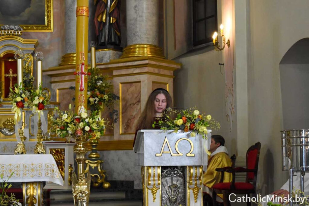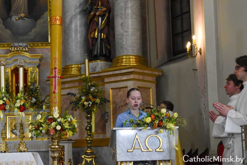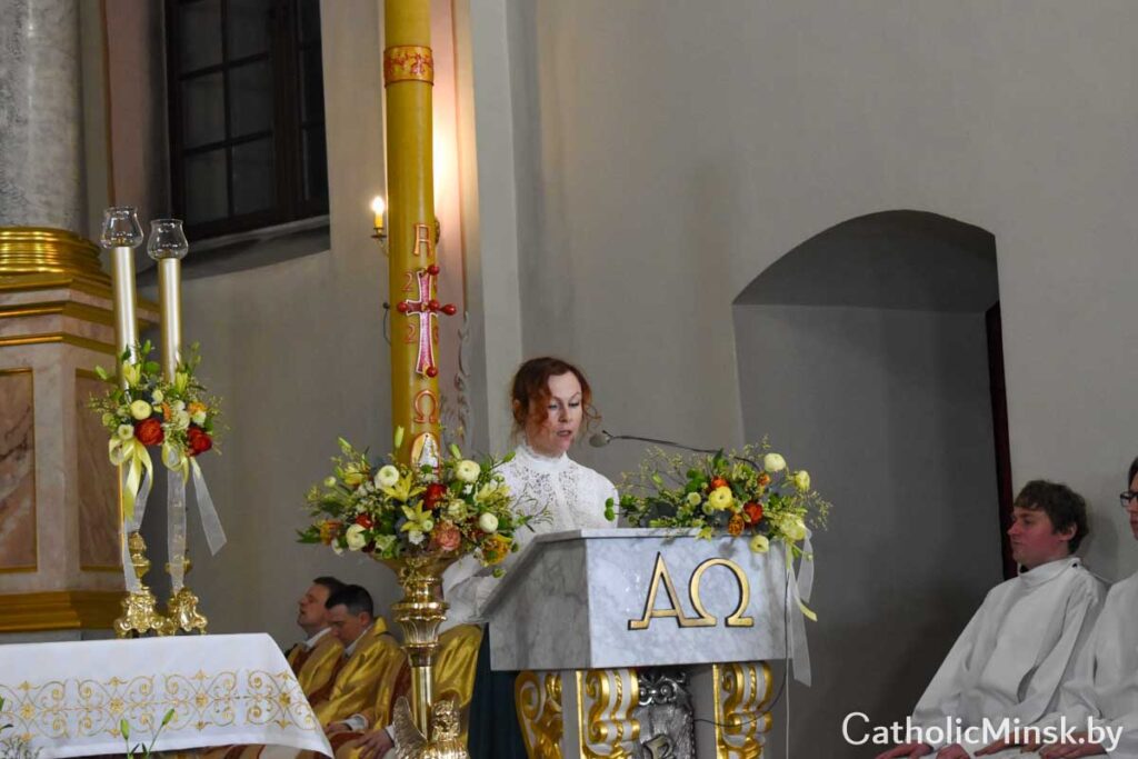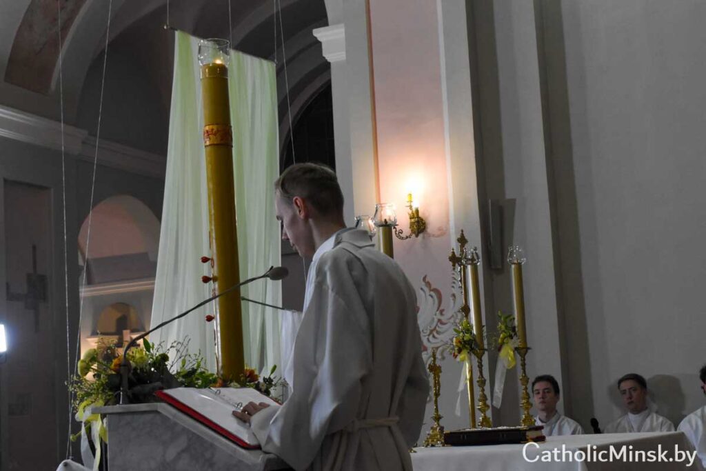 Пасля адспявання старажытнага велікоднага гімна Exultet распачалася Літургія слова, дзе прагучала дзевяць урыўкаў са Старога Запавету і чытанне з Евангелля. Кожны з урыўкаў нагадваў удзельнікам літургічнай цэлебрацыі пра поўны любові збаўчы план Бога ад стварэння свету да адкуплення чалавека Сынам Божым. Правобразам Пасхальнай вігіліі як літургічнага ўспаміну той ночы, калі Збаўца ўваскрос з памерлых, з’яўляецца ноч, у якую Бог вызваліў свой народ з егіпецкай няволі.