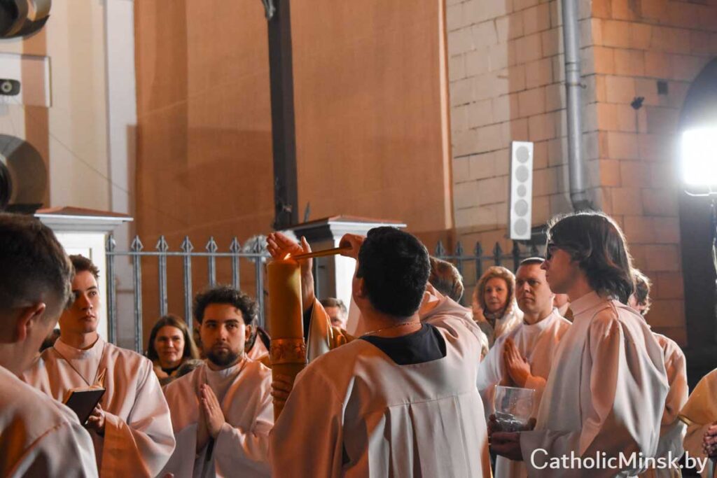 Святкаванне галоўнай хрысціянскай урачыстасці года распачалося Літургіяй святла. Перад уваходам у катэдру быў запалены пасхал — вялікая васковая свечка, якая сімвалізуе Уваскрослага Хрыста. Вернікі ў чуванні перад прыйсцем Пана трымалі прынесеныя свечкі, якія запалілі ад пасхала.